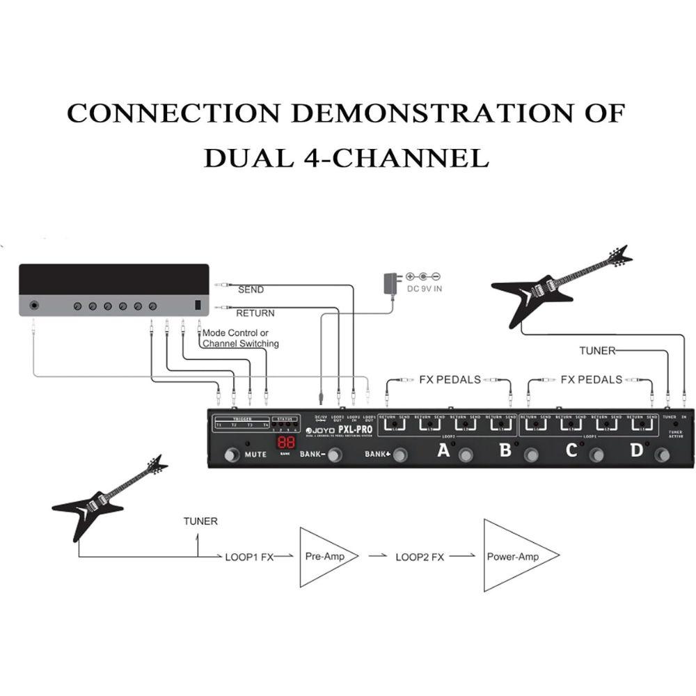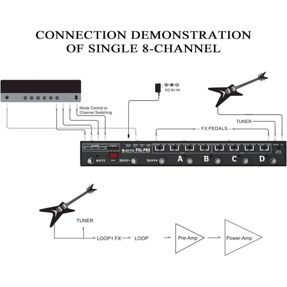The JOYO PXL-PRO is a versatile, programmable footswitch pedal loop controller designed for guitarists and bassists who need ultimate control over their pedalboard. Key Features: Total 8 LOOP channels, but can be used as dual independent 4-channel setting. Built-in 4 triggers enable you to use them to switch the Amp channel or effects mode settings. Four triggers can be set separately for trigger polarity, mode and action status (including the settings u