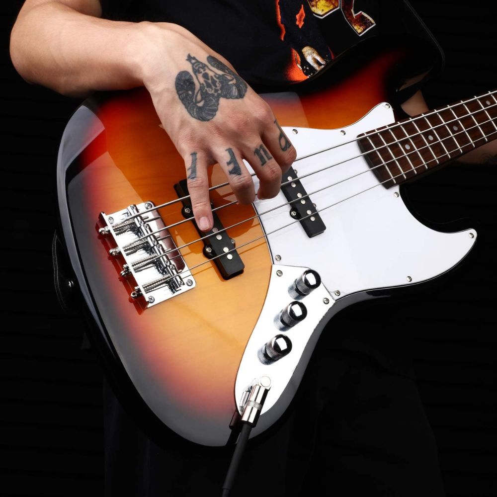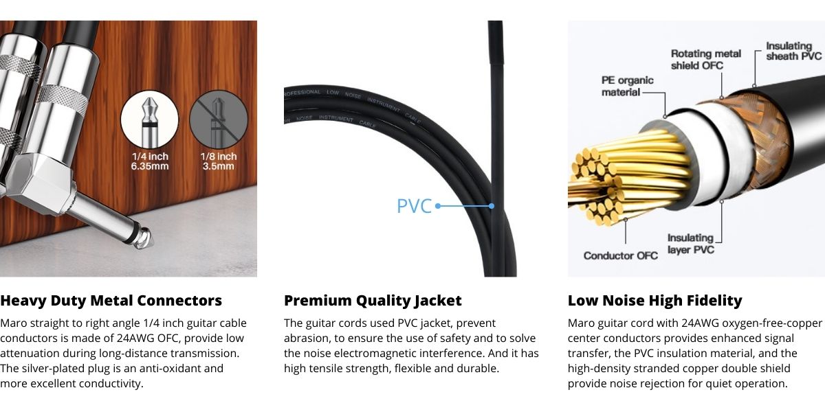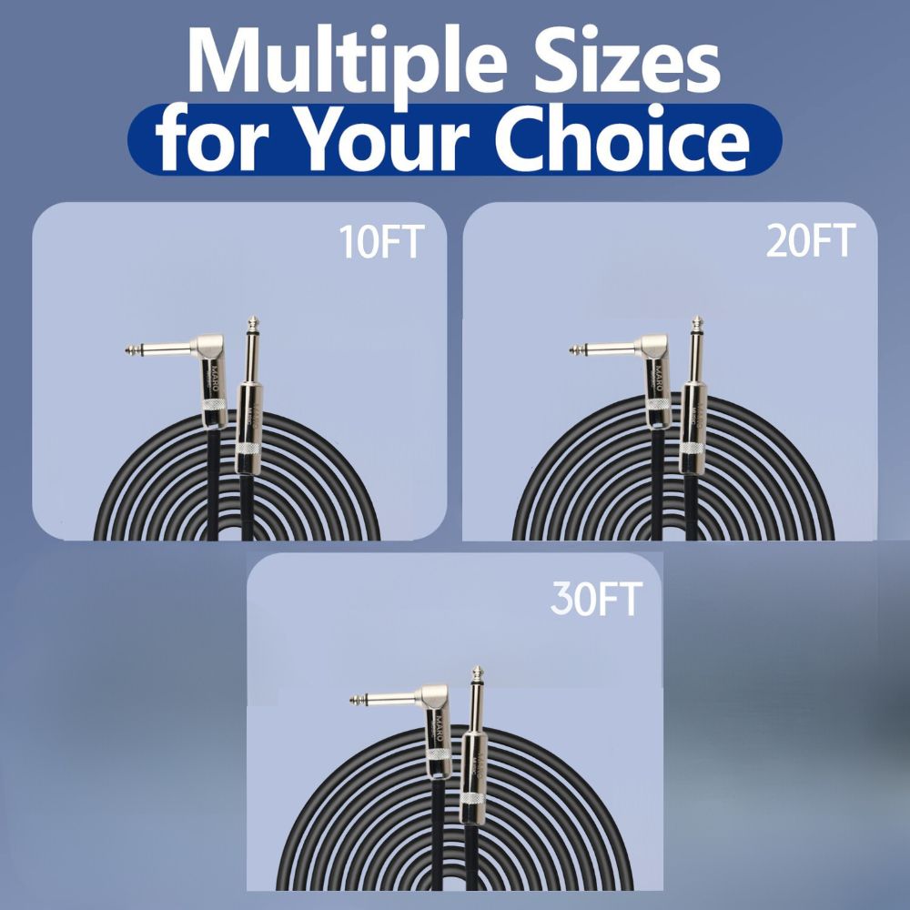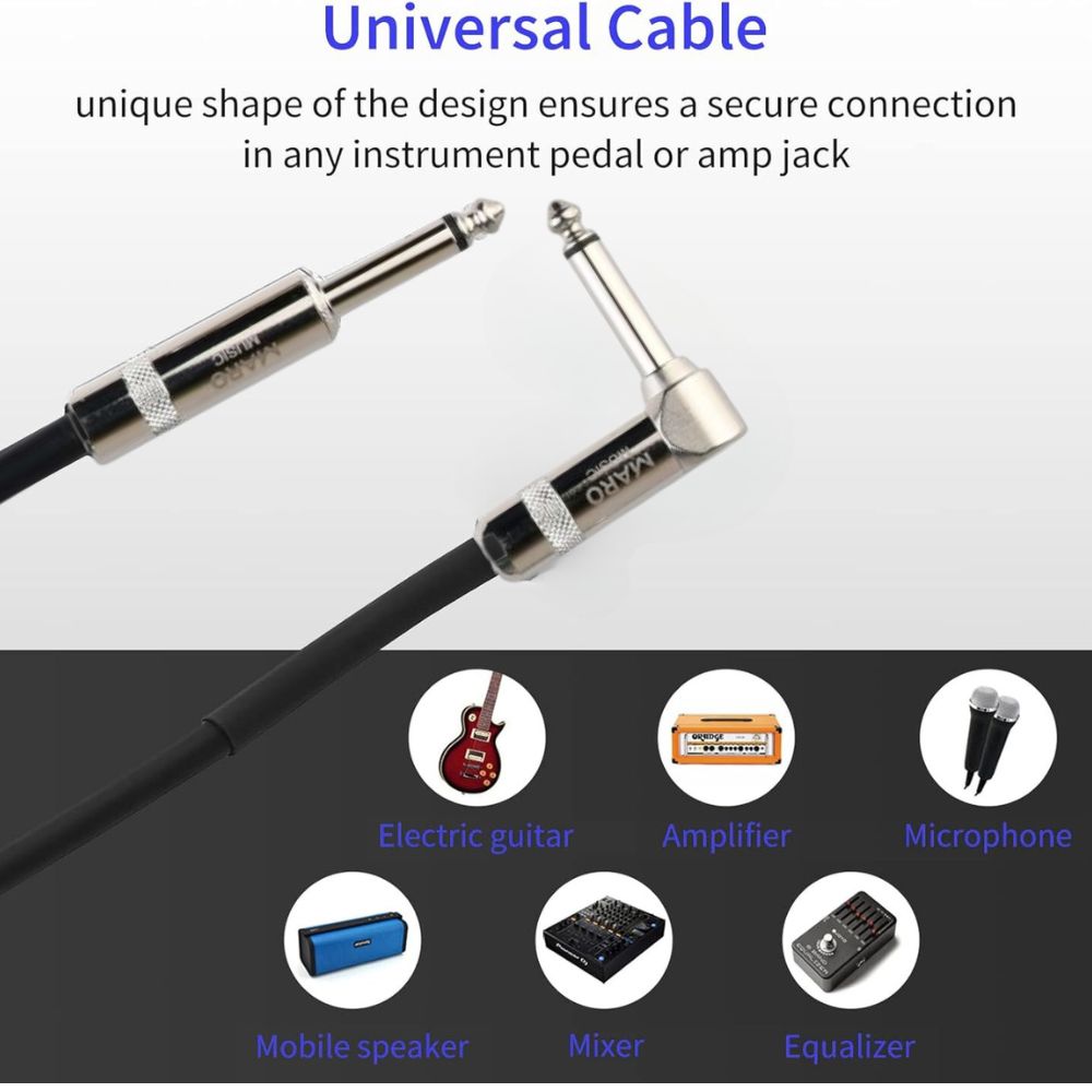 Enjoy quality music using your most valued instrument and this new Maro 1/4 Inch Right Angle to Straight Guitar Cable! Key Features: Designed with the finest materials, our electric guitar cable features 1/4" tips Multiple shielding materials preserve the signal with low handling noise Built to last, our electric guitar cord is made with 24AWG high-quality oxygen-free copper Ideal for connecting an electric guitar, bass, or keyboard to an ampl